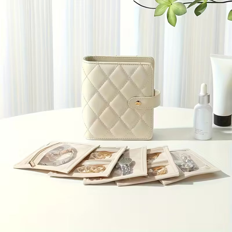 Introducing the Elegant Travel Jewelry Organizer Book – your ultimate solution to store and protect rings, earrings, bangles, necklaces, and watches in one chic, compact case. With a soft quilted finish and secure zipper pockets, it’s designed to keep your treasures safe whether at home or on the go.